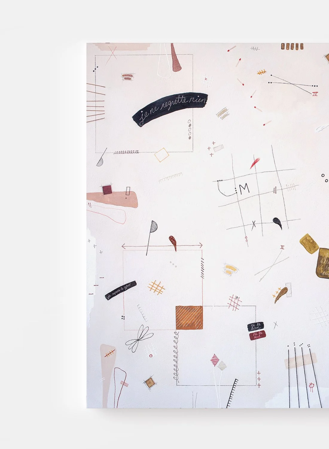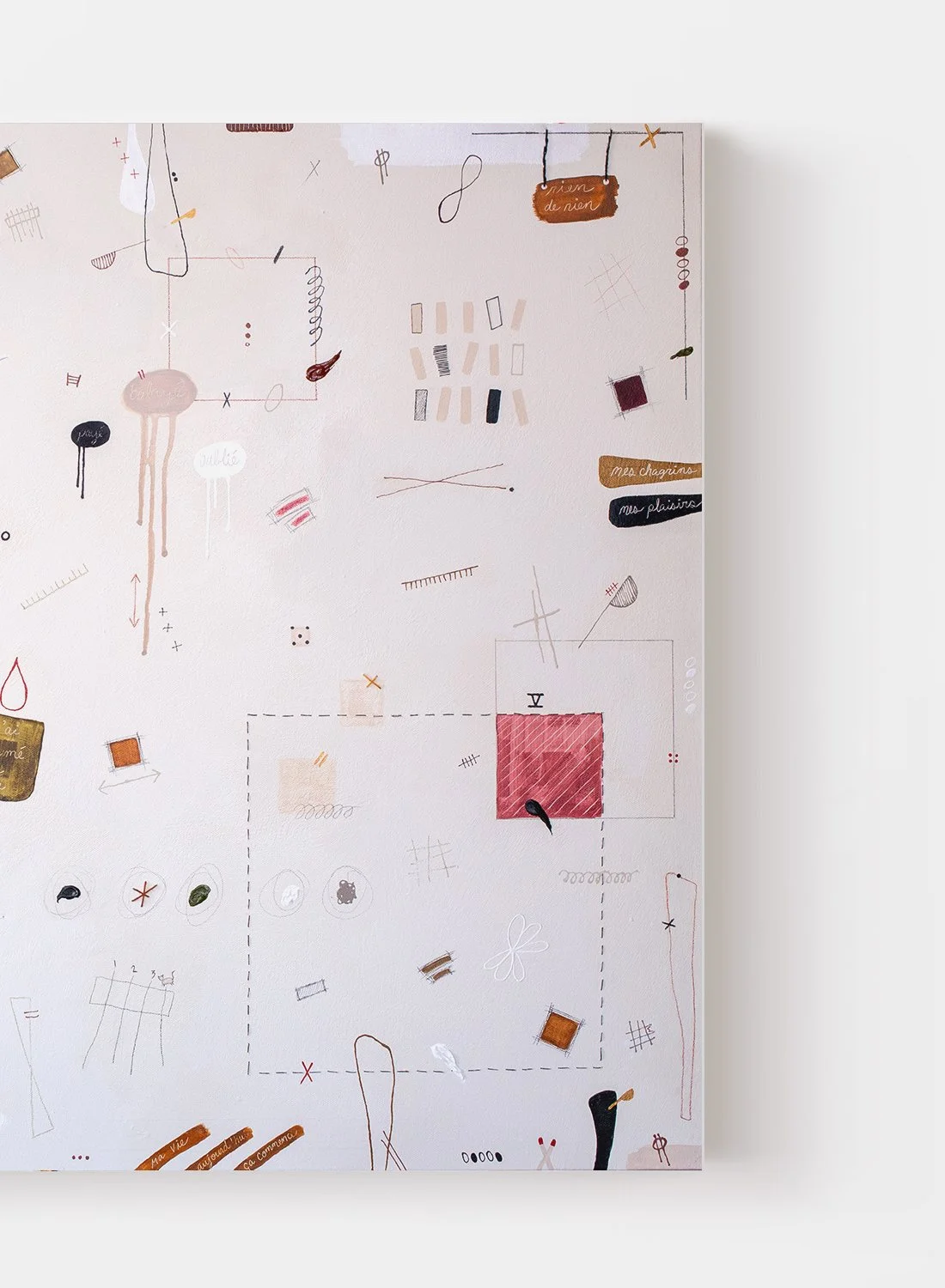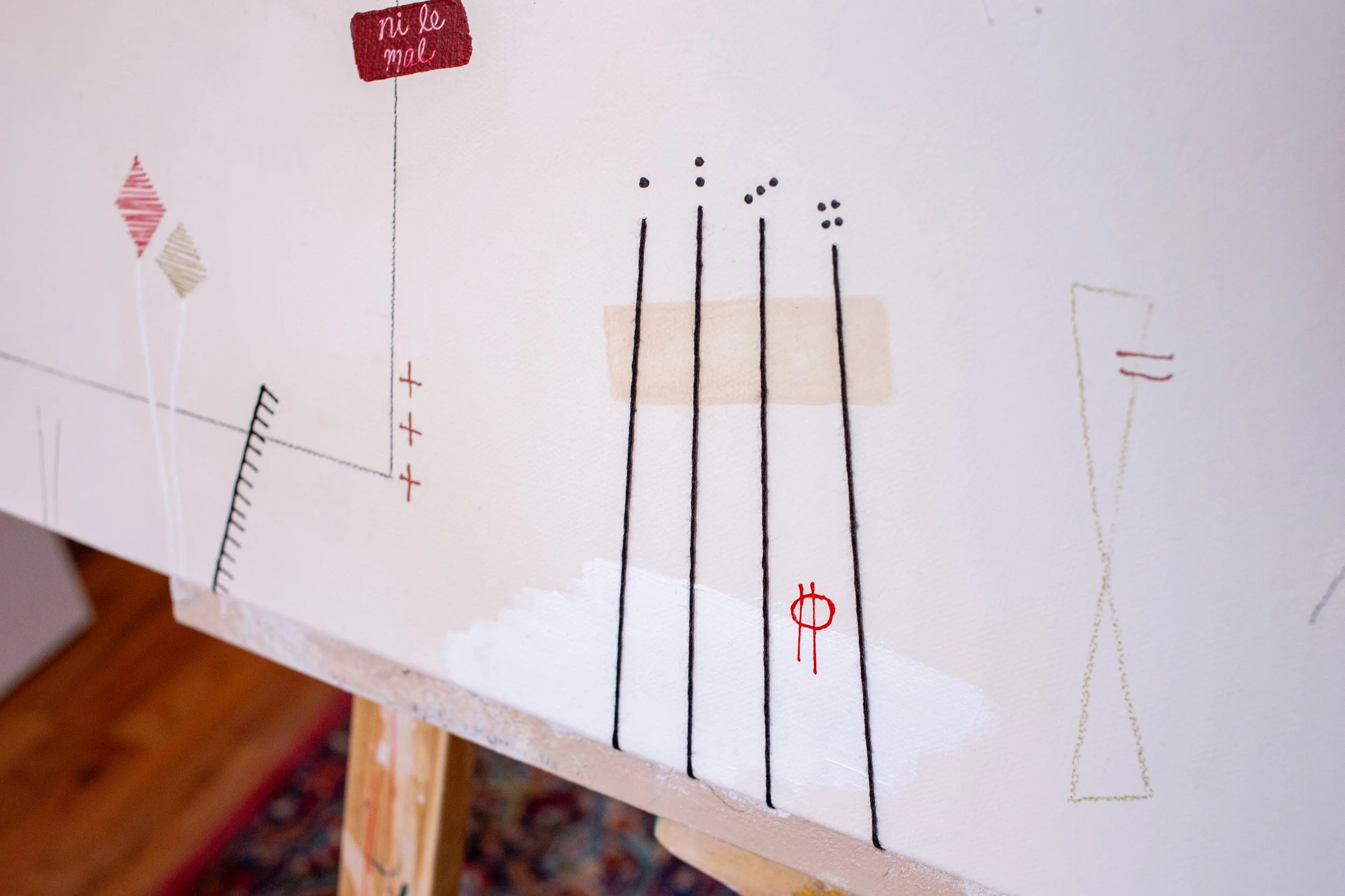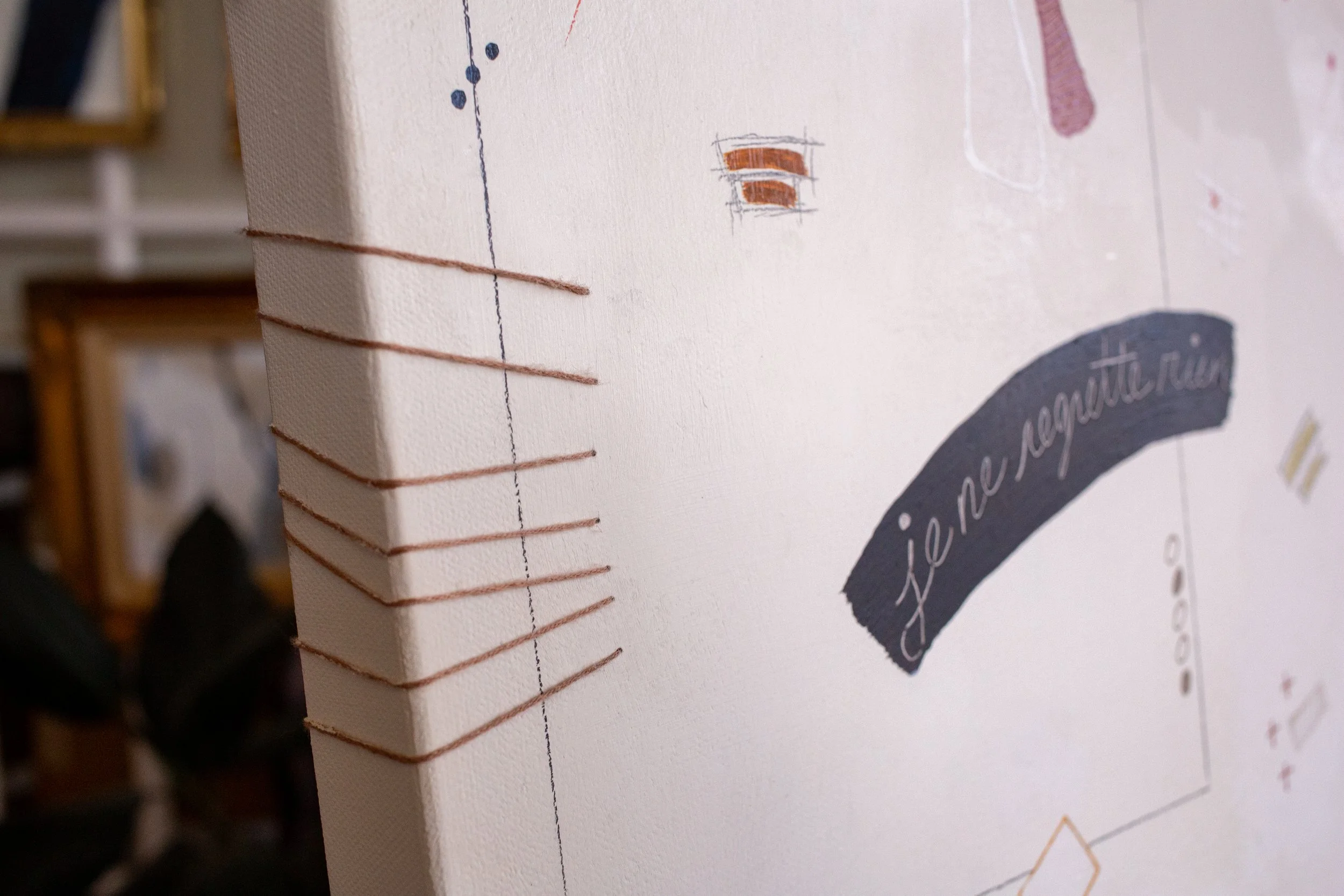 Rien de RienMaterials: Oil pastel, acrylic, graphite & thread on stretched canvasDimensions: 30” x 40” x 1.5” 2024
