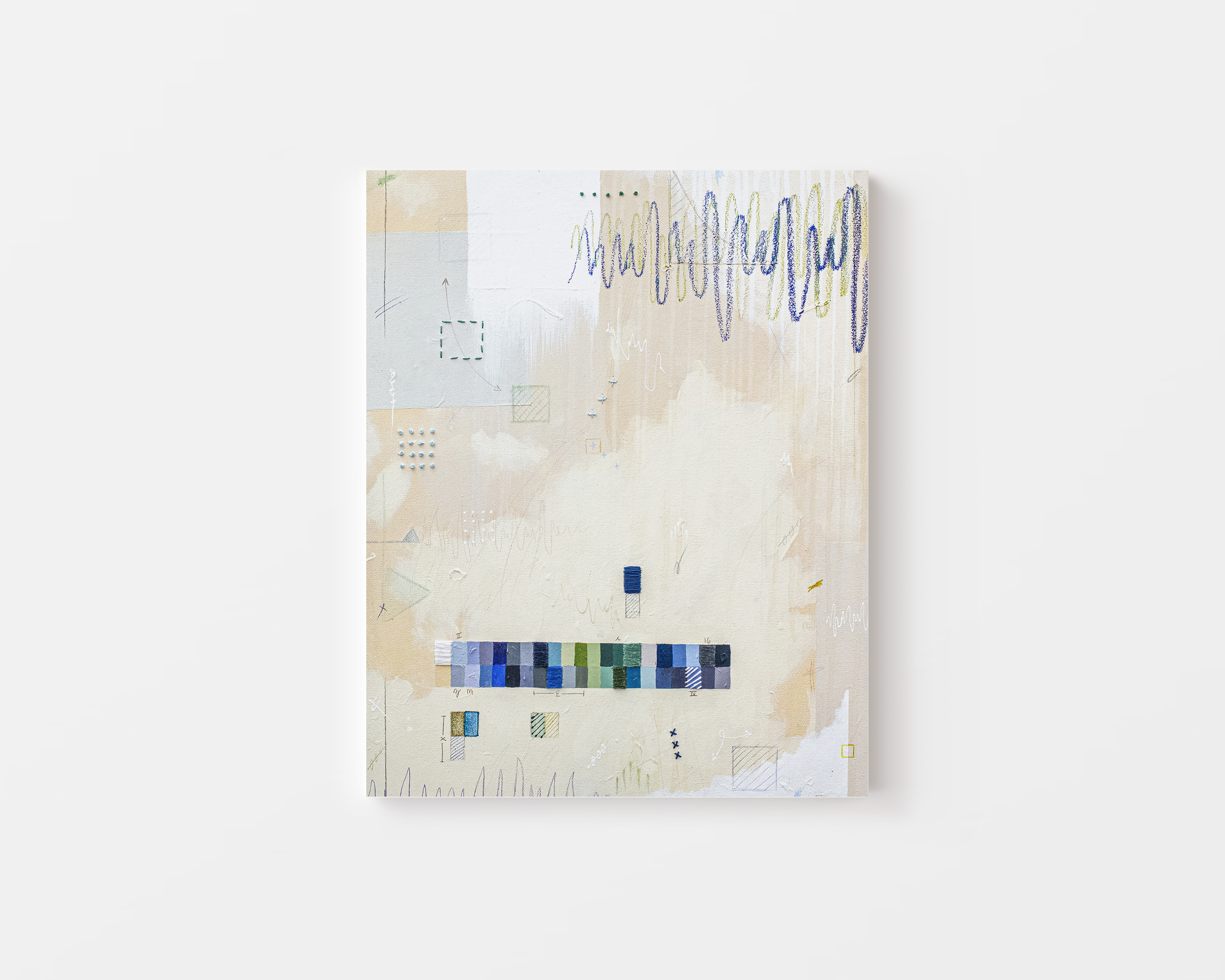 Mixed media with acrylic, oil pastel, charcoal & thread.